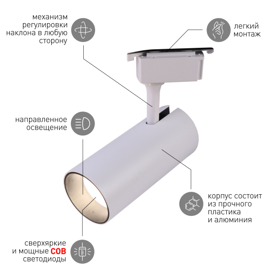 Однофазные трековые светильники поставляются в черном и белом цвете корпуса. Угол рассеивания света составляет 24 градуса, цветовая температура 4000К, что соответствует комфортному дневному свету. Светильники отлично подойдут для освещения торговых площадей или создания акцентов в жилых интерьерах, выполненных в современном стиле. Срок службы светодиодов составляет 50000 часов, за их стабильную и длительную работу отвечает современный импульсный драйвер, с защитой от скачков напряжения и высокочастотных помех. Все эти качества делают светильник отличным выбором для вашего проекта.